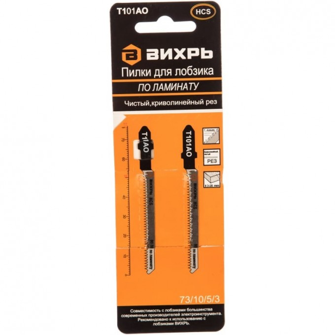 Пилки для лобзика Т101АО Вихрь 73/10/5/3 используются с электролобзиками для выполнения чистого криволинейного пропила ламината, толщиной от 3 до 20 мм.