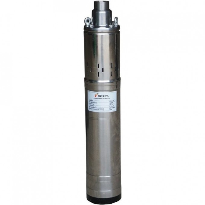 Насос Вихрь СН-90В монтируется в скважину за металлический трос, прикрепленный к петлям на корпусе. Тепловое реле защищает двигатель от перегрева и выхода из строя при отсутствии воды. Благодаря верхнему забору в винт попадает меньше песка и механических примесей. Их количество не должно превышать 50 г/м³.